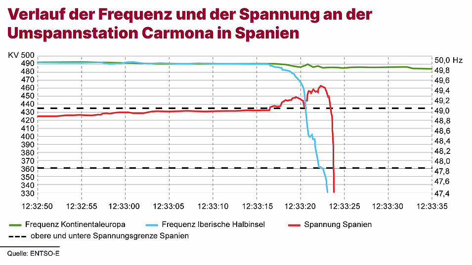 Schließlich durchbrach die Spannung die für das spanische Übertragungsnetz maßgebende Betriebsgrenze von 435 kV. Da das System nicht darauf ausgerichtet war, ein derartiges Zusammentreffen von Ereignissen zu bewältigen, kam es dann am 28. April, einem Montag, ab etwa 12 Uhr 33 zum Blackout.