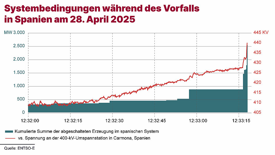 Vor dem Blackout wurden im spanischen und portugiesischen Netz Spannungsanstiege sowie Oszillationen beobachtet. Die Kaskade der Ereignisse beschleunigte sich um 12:32:57 Uhr mit der Abschaltung eines Erzeugungstransformators in der Region Granada, ausgelöst durch den Überspannungsschutz. In der Folge kam es zu weiteren Abschaltungen von Erzeugungsanlagen, insbesondere von PV und Wind. Zum Teil waren auch diese Abschaltungen auf den Überspannungsschutz zurückzuführen. Überdies stellt der Bericht fest, dass zwischen 12:32:00 und 12:32:57 ein Anstieg der Nettolast in den Verteilnetzen verzeichnet wurde. Die genauen Ursachen dafür wie zum Beispiel automatische Abschaltungen von kleinen Generatoren sind noch nicht abschließend geklärt, da die Nachvollziehbarkeit der Ereignisse auf Verteilnetzebene nur teilweise gegeben ist. Der Bericht stellt überdies fest, dass die automatischen Lastabwurfverfahren zwar aktiviert wurden, was den Zusammenbruch des Systems aber nicht verhindern konnte. Die tatsächlich abgeworfene Last lag teilweise weit unter den Zielwerten der Netz-Systemschutzpläne. In Spanien wurden statt der angestrebten 45 Prozent nur 34 Prozent abgeworfen.