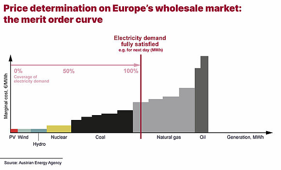 Wholesale electricity prices are determined through the interplay of supply and demand. The distinguishing feature of how electricity prices are set is called the merit order. Power stations are ordered according to their marginal costs – in other words, the costs incurred by generating one additional megawatt hour of power at the power station concerned. The price that all generating stations receive for their electricity is equal to the marginal costs of the last power plant from which electricity is called off in order to meet demand.
