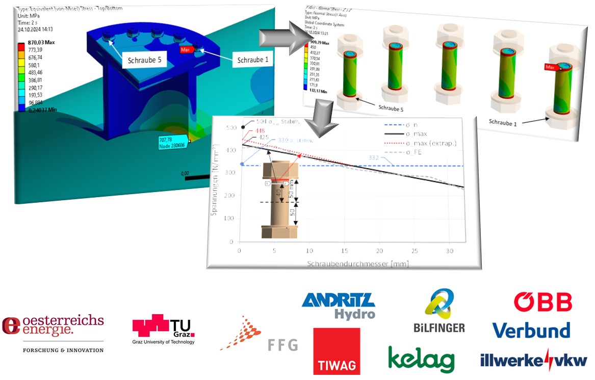 Hinsichtlich der Schraubenbeanspruchungen an den verschraubten Anschlussdeckeln wurden jedoch unerwartet große Unterschiede zwischen den einzelnen Schrauben festgestellt sowie hohe überlagerte Biegebeanspruchungen. Bei freigestellten Flanschen liegen hohe überlagerte Biegespannungen auch für den Lastfall der alleinigen Schraubenvorspannung vor.