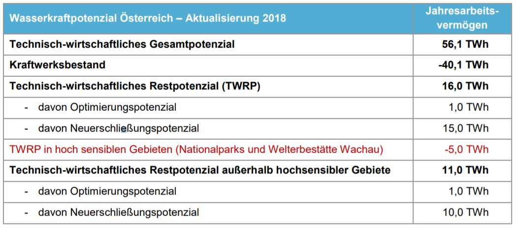 Aus der Summe der Anlagen größer 5 MW (35,7 TWh) und kleiner 5 MW (4,4 TWh) ergibt sich ein Kraftwerksbestand von ca. 40,1 TWh. Subtrahiert man dieses bereits ausgebaute Potenzial vom Technisch-Wirtschaftlichen Gesamtpotenzial (56,1 TWh) erhält man ein TechnischWirtschaftliches Restpotenzial von 16 TWh. Dieser Wert beinhaltet ein Optimierungspotenzial von rund 1 TWh. Das Potenzial, welches durch Neuanlagen oder Anlagenerweiterungen technisch und wirtschaftlich sinnvoll gehoben werden kann, beträgt ungefähr 15 TWh. Etwa 5 TWh dieses Neuerschließungspotenzials befinden sich in den österreichischen Nationalparks und in der Welterbestätte Wachau. Das Technisch-Wirtschaftliches Restpotenzial außerhalb dieser hochsensiblen Gebiete beträgt insgesamt ca. 11 TWh. Dieser Wert beinhaltet ein Optimierungspotenzial von rund 1 TWh und ein Neuerschließungspotenzial von ca. 10 TWh. Die wesentlichen Kenndaten des österreichischen Wasserkraftpotenzials sind in der nachfolgenden Tabelle zusammenfassend dargestellt: