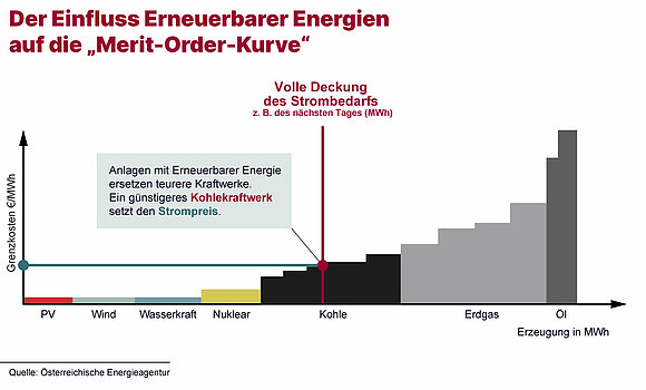 Da sich in den Grenzkosten insbesondere die Kosten für Brennstoffe wie Gas oder Kohle sowie Ausgaben für CO2-Bepreisung niederschlagen, sind thermische Anlagen wie Gas- oder Kohlekraftwerke preissetzend. Kraftwerke hingegen, die Energie aus erneuerbare Quellen wie Wind, Wasser oder Sonne nutzen, haben sehr niedrige Grenzkosten. Wenn diese Produzenten in der Lage sind den gesamten oder zumindest einen großen Teil des Strombedarfs zu decken, verdrängen sie die teureren Anbieter aus dem Markt – und bewirken damit sinkende Strompreise.