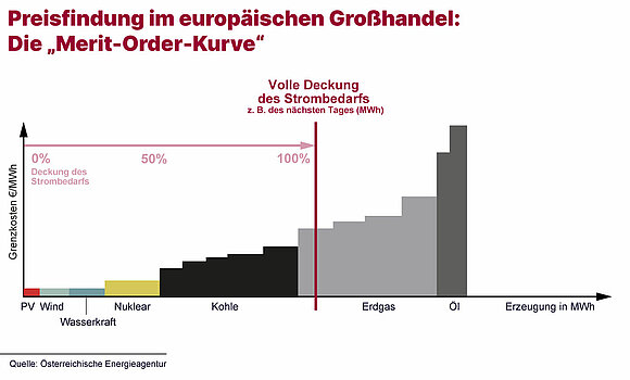 Der Strompreis am Großhandelsmarkt entsteht durch ein Zusammenspiel von Angebot und Nachfrage. Das Besondere an der Preissetzung im Strommarkt ist die sogenannte „Merit Order“. Dabei werden die Kraftwerke aufsteigend nach ihren Grenzkosten sortiert – also den Kosten, die die Erzeugung einer weiteren Megawattstunde (MWh) beim jeweiligen Kraftwerk verursacht. Die Grenzkosten des letzten Kraftwerks, das gerade noch zur Deckung der Stromnachfrage gebraucht wird, geben den Preis vor, den alle Kraftwerke für ihren Strom erhalten.